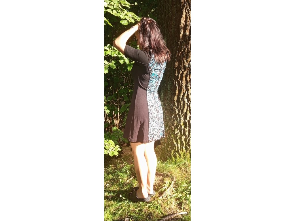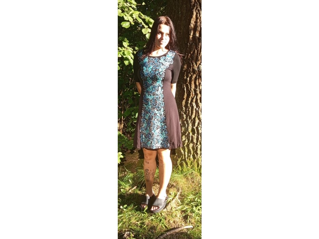 Černé elegantní teplejší šaty se skrytým zipem, vhodné na podzim a jaro. Ručně malované motivem motýli a arabesky modro bílo stříbrné. Velikost M, materiál viskoza s elastenem.