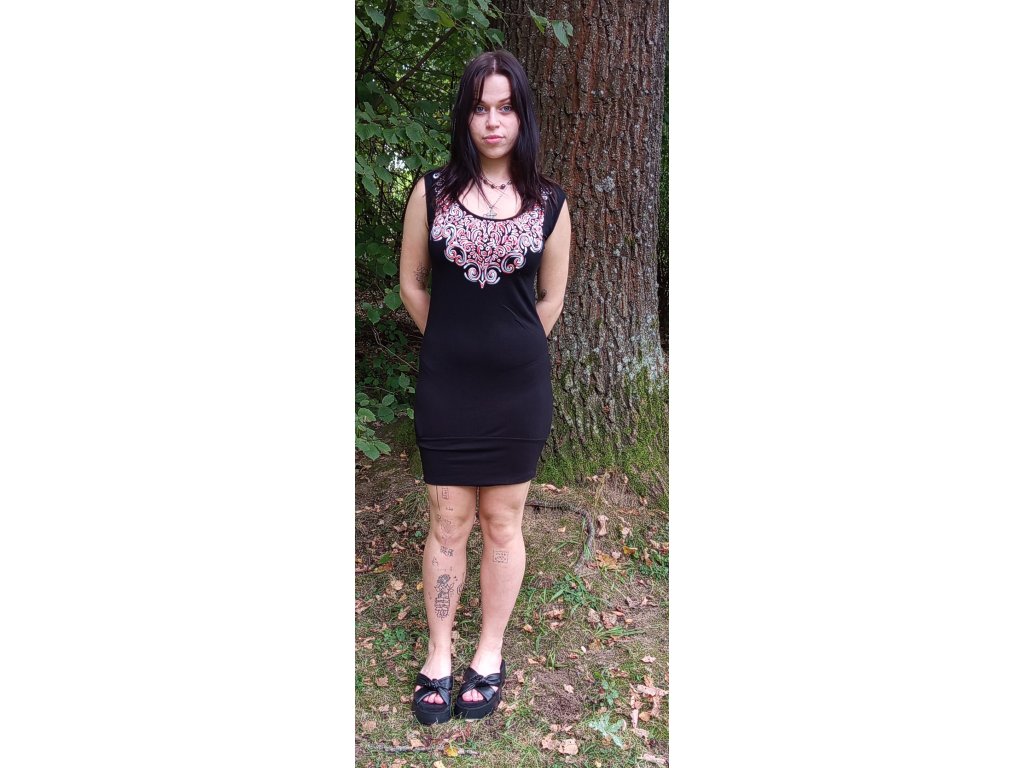 Černé pohodlné šaty s elastenem celkově volnější dole s širokou pevnější manžetou také pružnou. Klasická podprsenka je vzadu vidět, lépe zvolit jinou alternativu. Dekor 4erveno- bílé arabesky. Velikost S, materiál s elastenem.