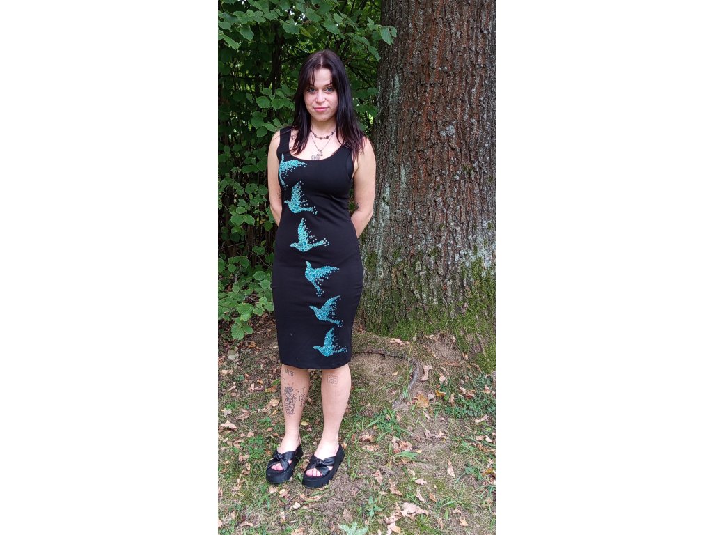 Černé třičtvrteční šaty bez rukávů s moderním motivem tyrkysové holubice