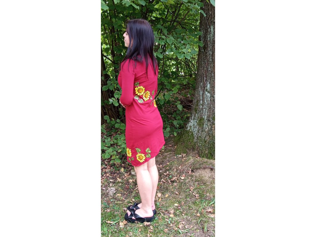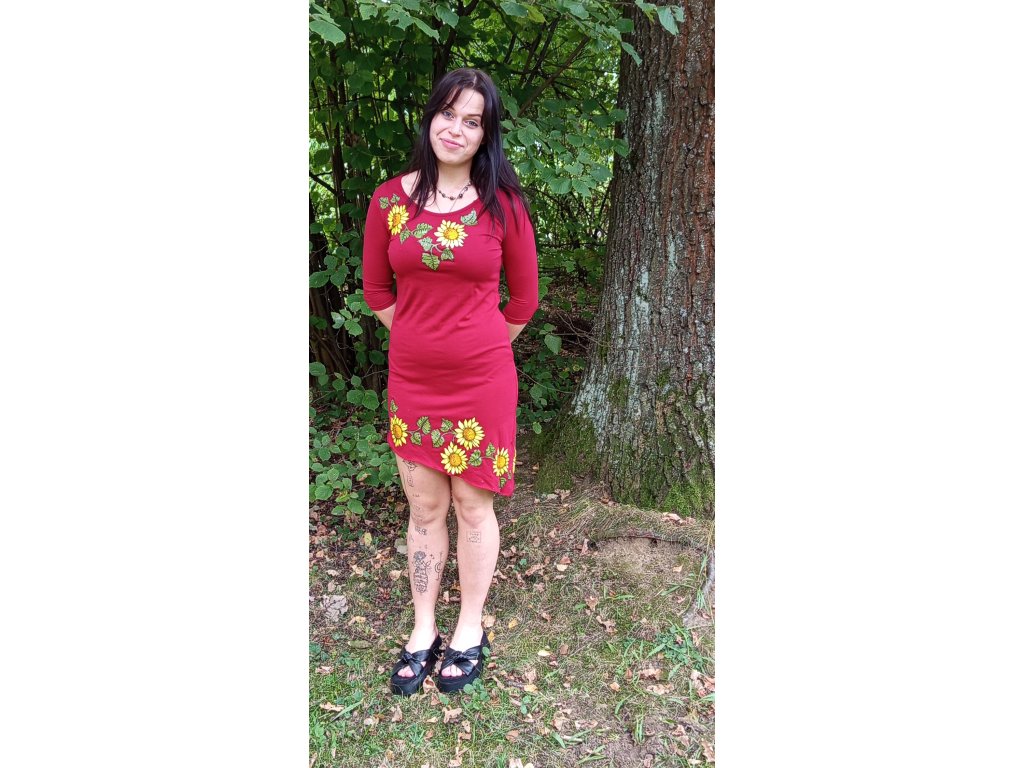 Červené třičtvrteční šaty, třičtvrteční rukáv, zkosená spodní část motiv slunečnice. čistá bavlna, velikost S
