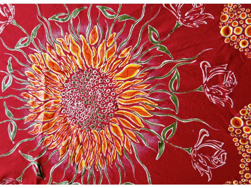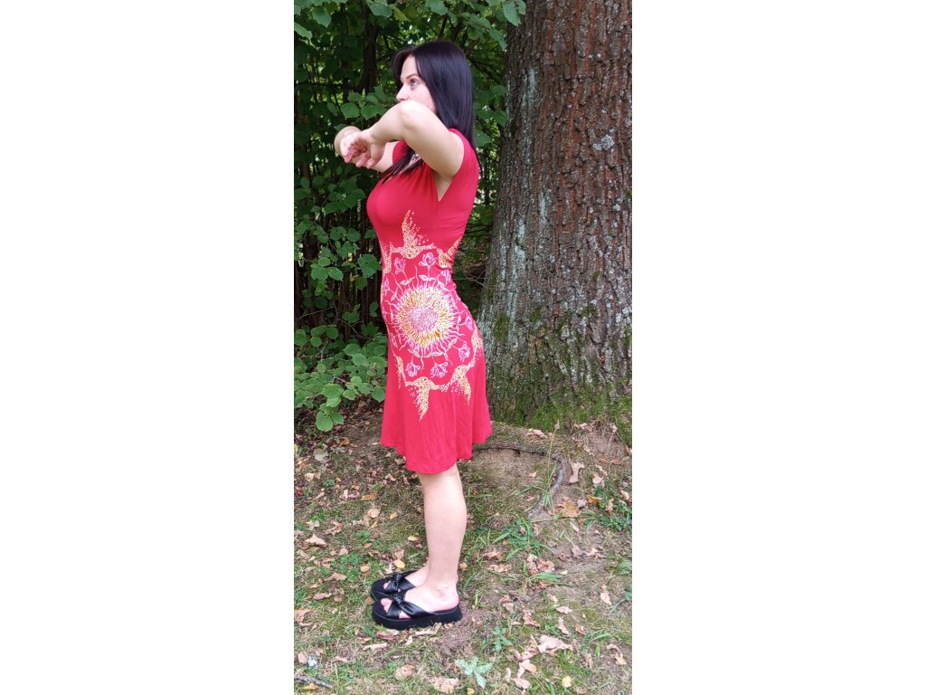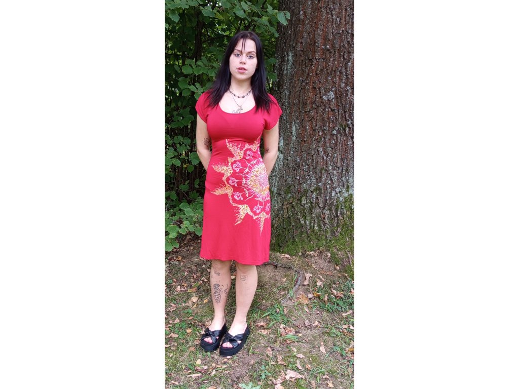 Červené šaty s krátkým rukávem s dekorem květinové mandaly. Velikost S, materiál s elastenem