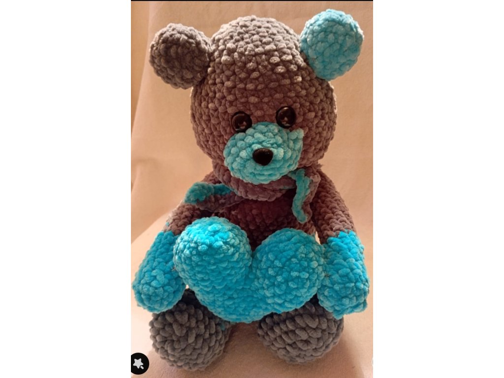Medvídek háčkovaný hnědomodrý, výška 30 cm, vlna Himalaya
