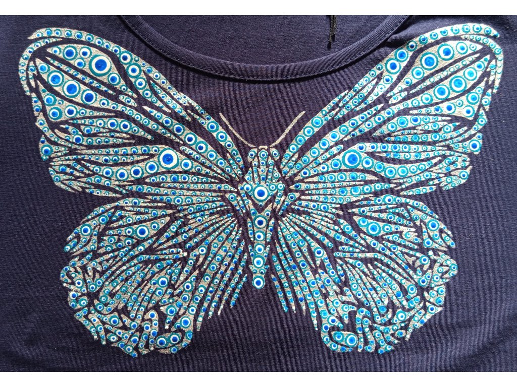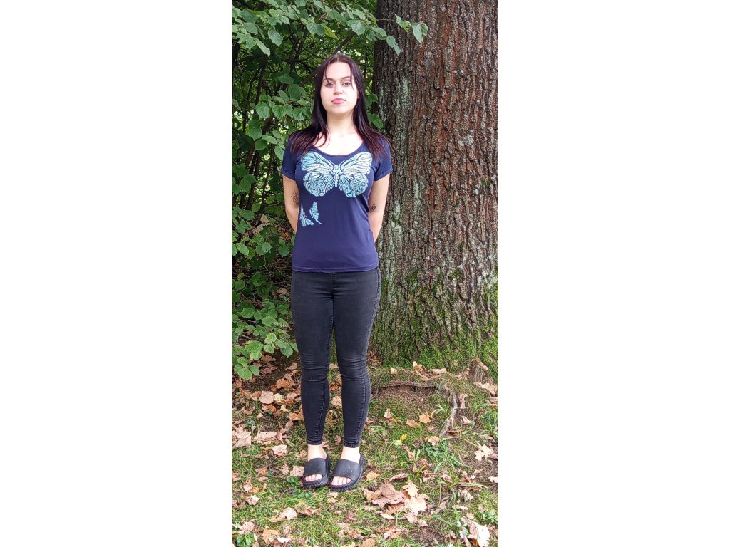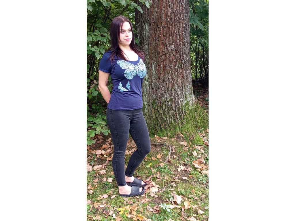 Tmavě modré tričko s krátkým rukávem s motivem motýlů, velikost M, materiál bavlna s elastanem