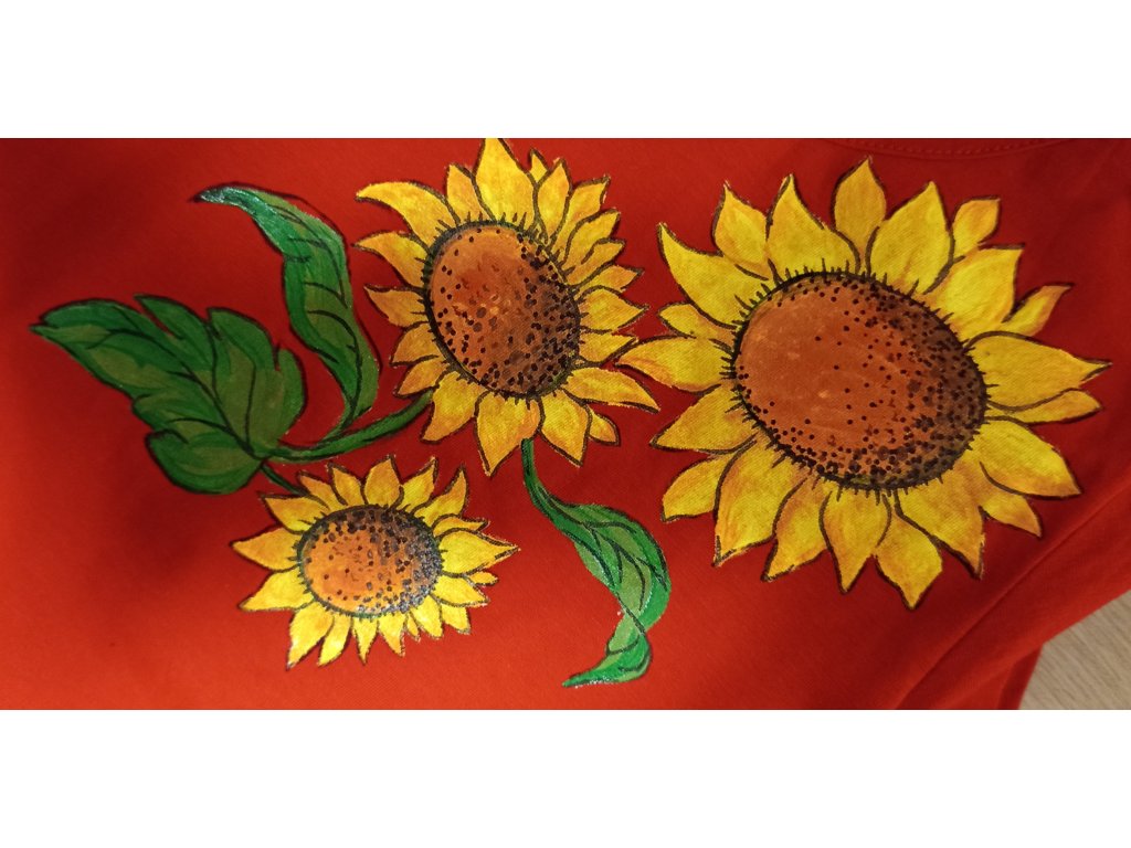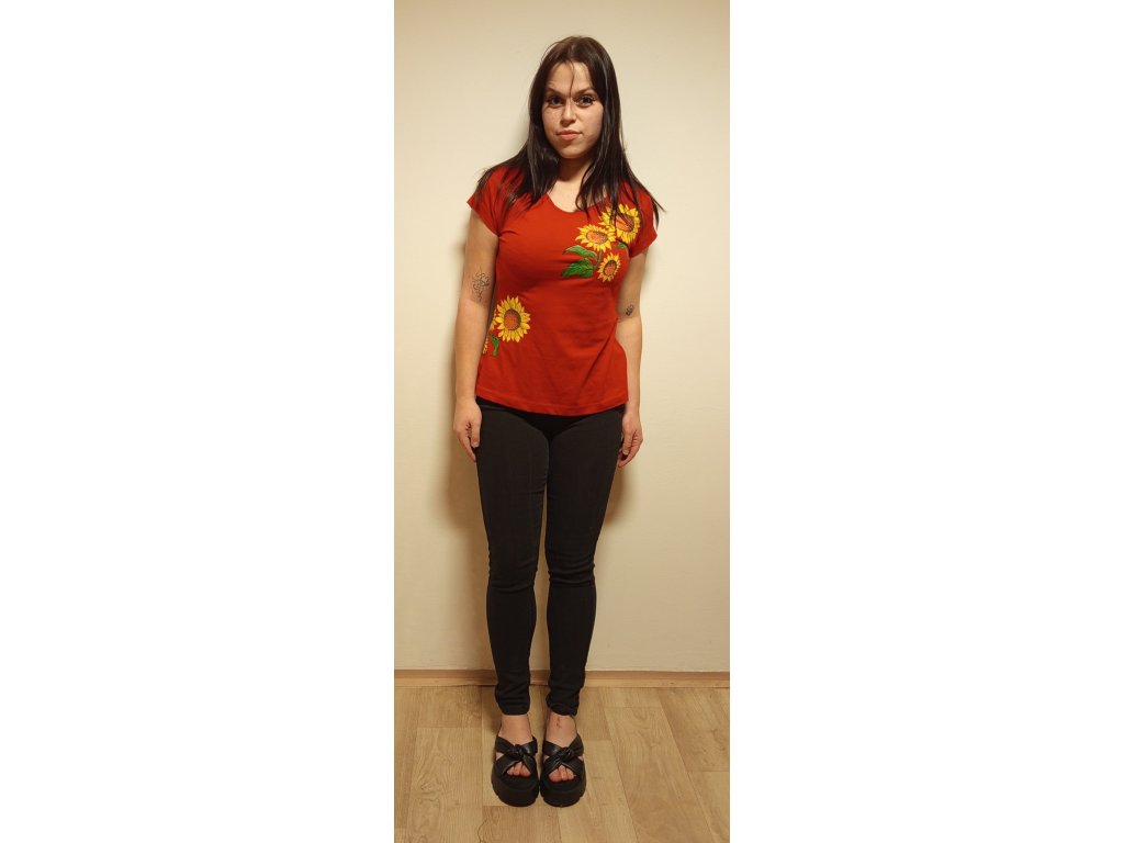 Tričko s krátkým rukávem červené s motivem slunečnic, velikost M, materiál bavlna